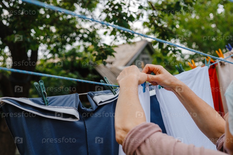 Женщина прикрепляет одежду с помощью шнурков к веревкам для сушки снаружи