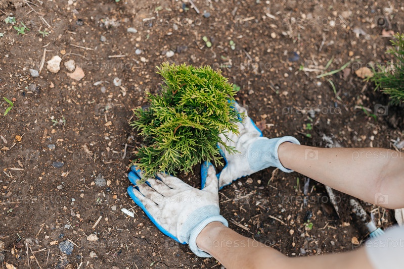 С перчатками на руках садовник посадил в почве маленький зеленый куст