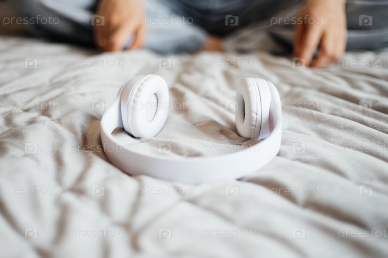 Белые беспроводные наушники для ушей лежат на уютном ковре