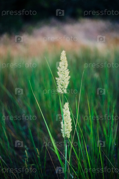Деликатная пернатая травянистая семенная голова стоит высоко на пышно-зеленом лугу. фоновое изображение