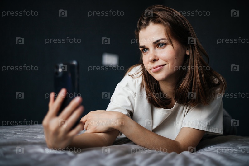 Молодая женщина с коричневыми волосами и голубыми глазами лежит на кровати, поднимает свой смартфон, чтобы сделать селфи с нежной улыбкой