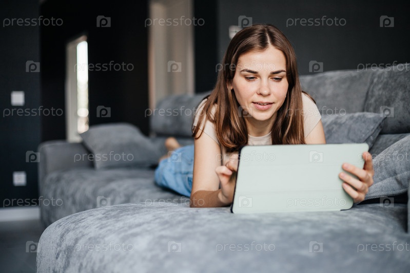 Женщина лежит на удобном диване, поглощена своим планшетом и наслаждается досугом в помещении