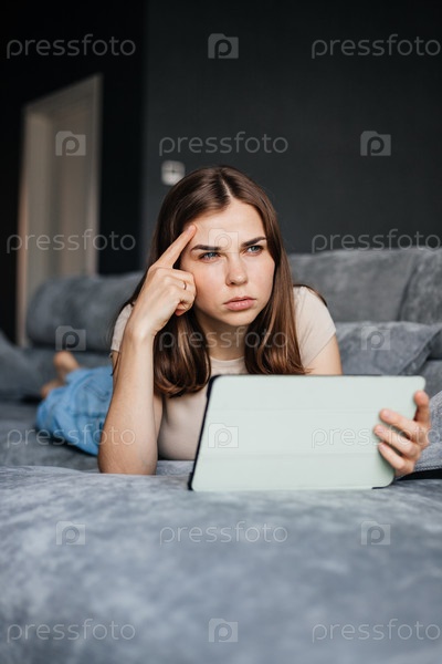 Молодая женщина лежит на диване с планшетом в руках и внимательно отворачивается