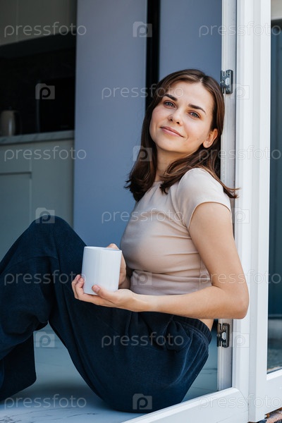 Расслабленная женщина с нежной улыбкой держит кружку, удобно сидящая возле открытой двери, олицетворяющая мирное одиночество и момент размышления