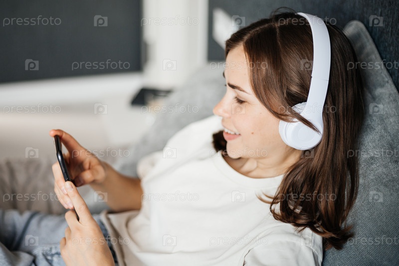 Молодая женщина, одетая в наушники и смотрящая на свой смартфон во время отдыха на диване
