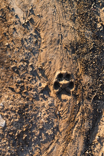 Большой, прозрачный отпечаток лапы животного хорошо виден на сухой текстурированной почве