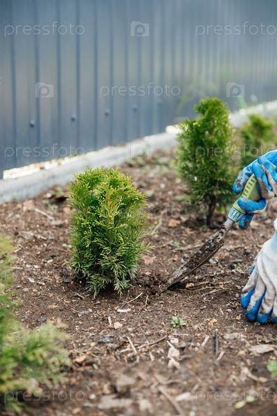 Человек, носящий садовые перчатки, использует лопатку для посадки молодого хвойного дерева в землю рядом с забором