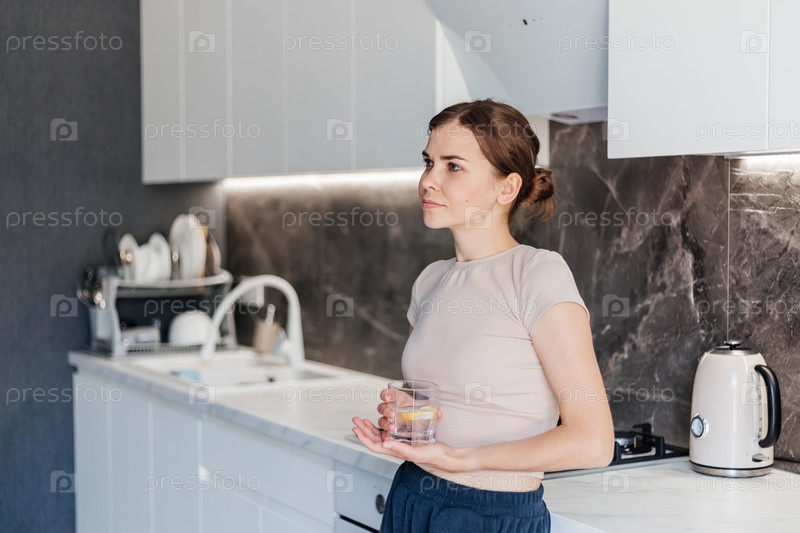 Молодая женщина стоит на своей современной кухне, держа освежающий стакан воды с кусочкой лимона