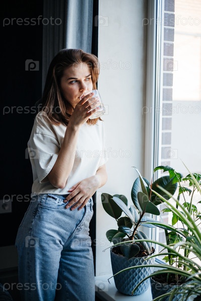 Вдумчивая молодая женщина стоит у окна, держит стакан воды и вдумчиво смотрит наружу, окруженная пышными зелеными растениями