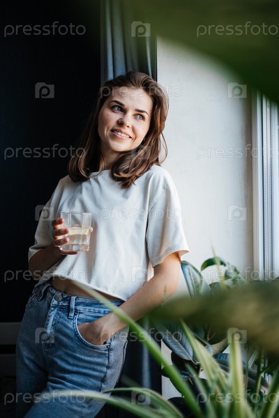Молодая женщина с коричневыми волосами и голубыми глазами улыбается, держа в руках стакан воды и стоя у окна с растениями