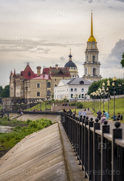 Набережная в городе Рыбинск, Спасо-Преображенский собор и зерновая биржа на берегу Волги