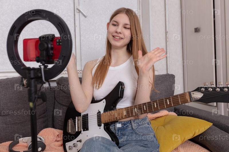 Молодая женщина сидит на диване, улыбается и машет камерой, установленной на кольцевом светильнике.Она играет на электрической гитаре в яркой гостиной, заполненной мягкими цветами