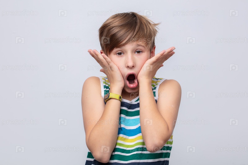 Удивленный мальчик показывает шок и волнение с руками на лице в полосатом майке на светлом фоне