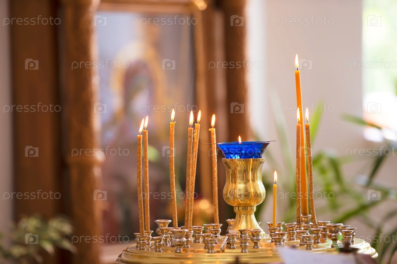 Золотые свечи и декоративная лампа создают теплое сияние в спокойной комнате, улучшая атмосферу духовного собрания в храме или доме