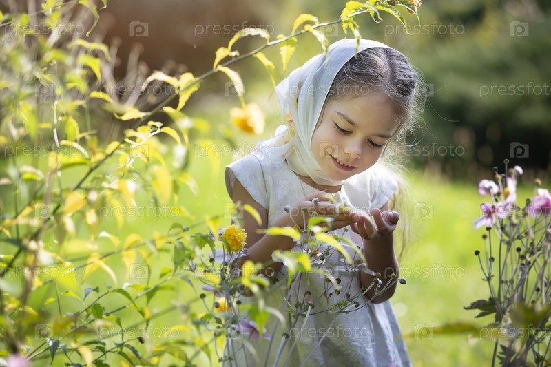 Девушка наслаждается красотой весенних цветов в пышном саду.Облекая легкий шарф и белое платье, она с любопытством и радостью наблюдает за растениями среди разноцветных цветков