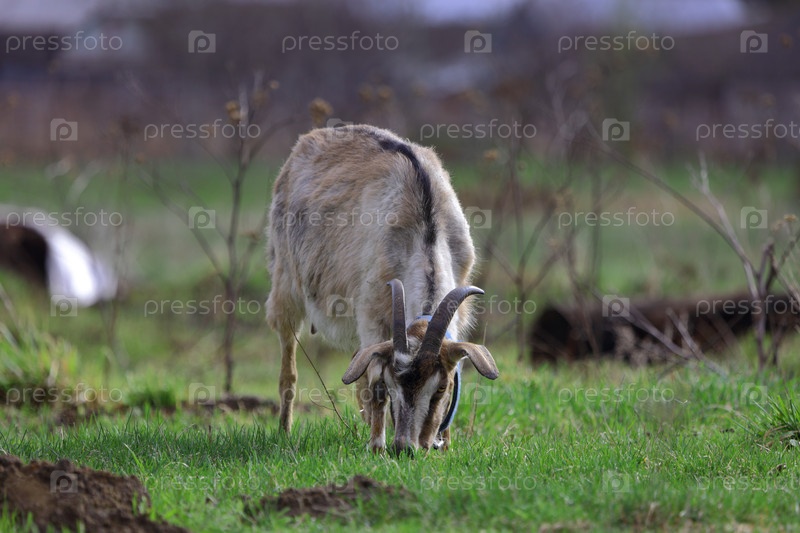 Серая коза пасется на зеленом лугу