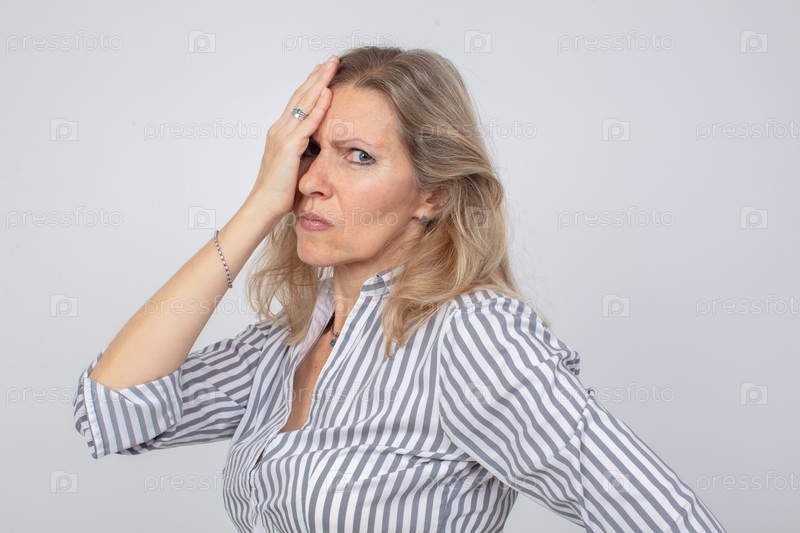 Женщина проявляет разочарование, прижимая руку к лбу в полосатой рубашке.Экспрессия предполагает, что она чувствует себя подавленной или напряженной в нейтральной обстановке