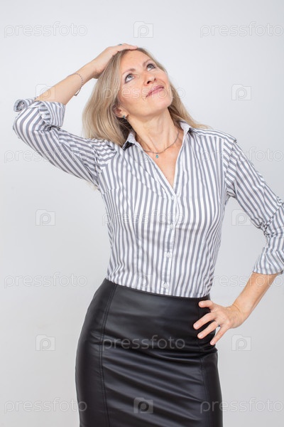 Уверенная в себе женщина позирует с продуманным выражением лица, при этом корректируя волосы в стильном наряде