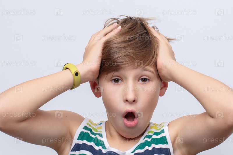 Молодой мальчик демонстрирует удивление и шок с руками на голове в непринужденном летнем костюме на светлом фоне