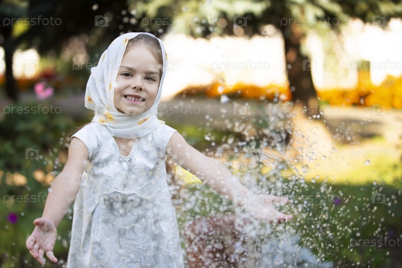 Девочка с радостной улыбкой играет в саду, брызгая водой по всему дому.Она носит шарф и белое платье, окружена яркими цветами и зеленью днем