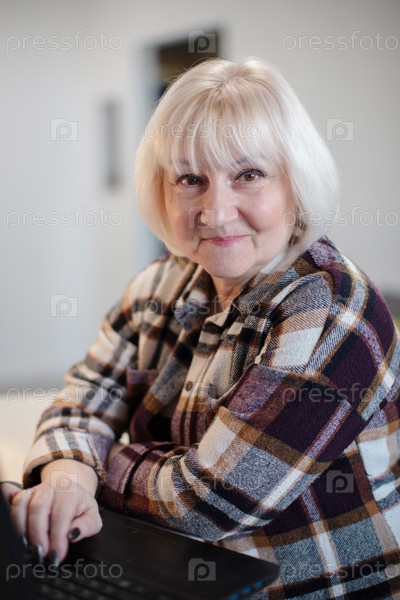 Пожилая женщина работает на ноутбуке в уютном помещении днем