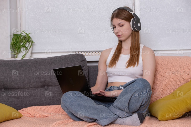 Молодая женщина сидит скрещенными ногами на диване, сосредоточенная на своем ноутбуке.Она носит наушники и окружена красочными подушками, подчеркивающими расслабленную домашнюю рабочую среду