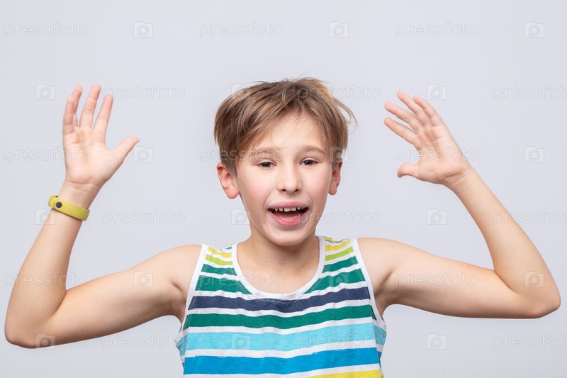 Взволнованный мальчик, выражающий радость с поднятыми руками в веселой обстановке днем