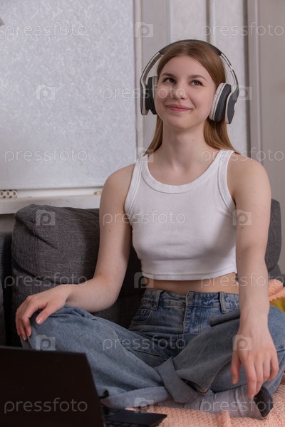 Молодая женщина сидит скрещенными ногами на диване, глубоко занята своей музыкой.Она носит наушники и имеет радостное выражение лица, наслаждаясь своим расслабленным временем дома