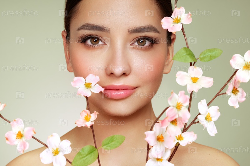 Красивая молодая женщина с ветвью вишневого цветка