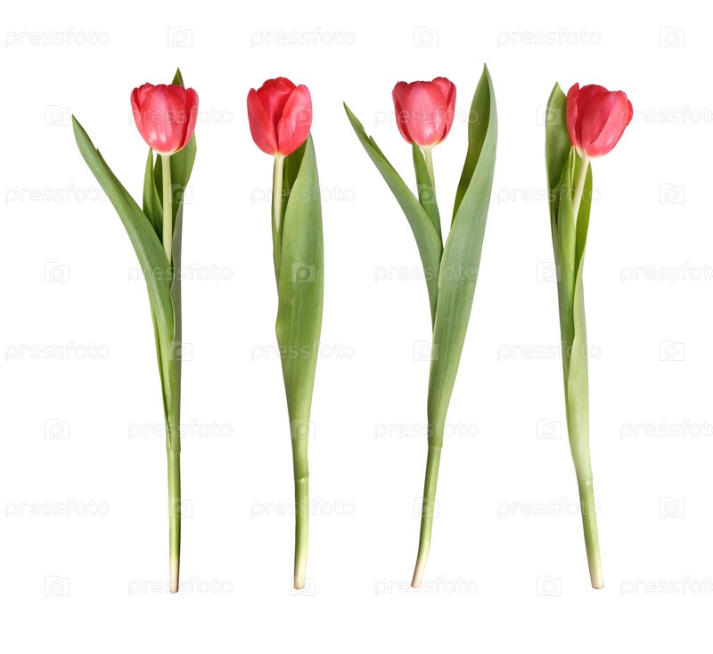 Один ярко-красный тюльпан с пышными зелеными листьями представлен изолированно на простом белом фоне