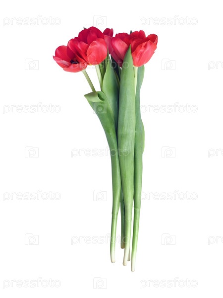 Яркие розовые тюльпаны с пышными зелеными листьями представлены изолированно на простом белом фоне