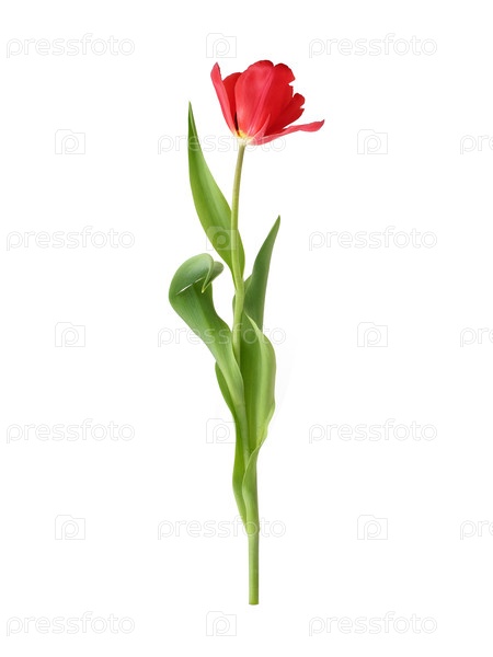 Один яркий желтый тюльпан с пышными зелеными листьями представлен изолированно на простом белом фоне