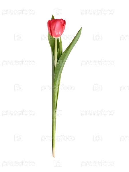 Один ярко-красный тюльпан с пышными зелеными листьями представлен изолированно на простом белом фоне