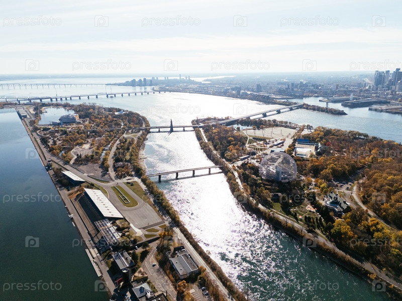 Вид из воздуха Монреаля с биосферой и осенним пейзажем над речными островами