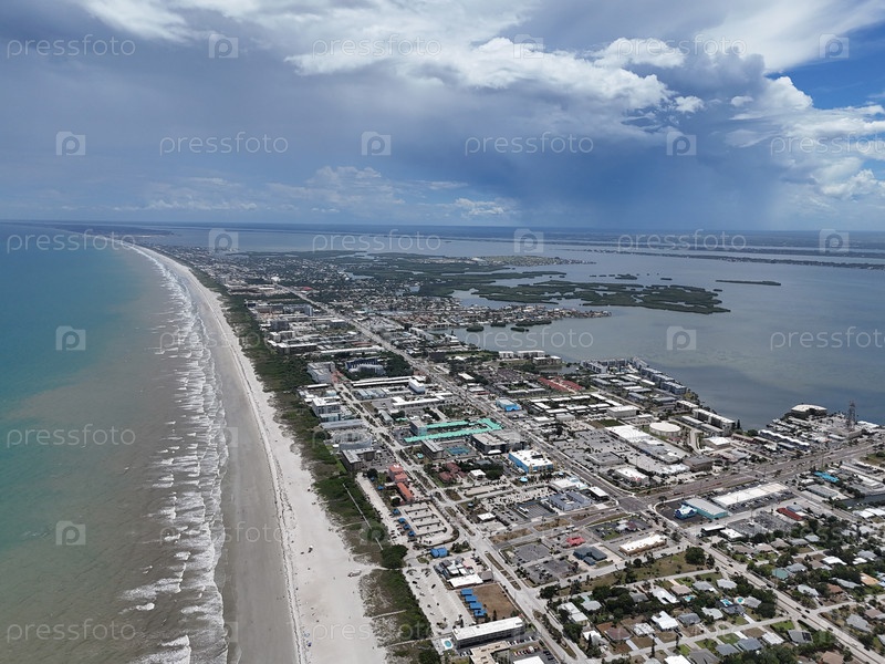 Вид с воздуха на Кокао-Бич и береговую линию мыса Канаверал, штат Флорида, побережье Атлантического океана и пирс. g