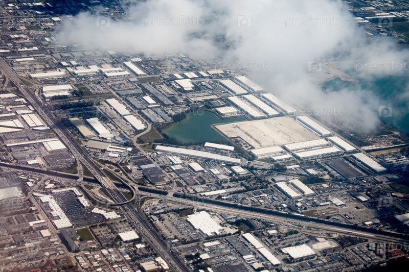 Вид с воздуха на промышленные склады Майами, жилые районы и искусственные озера карьера во Флориде, США. g