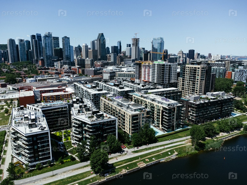 Вид из воздуха городского ландшафта с небоскребами и зелеными насаждениями.Гриффинтаун, Монреаль, Канада