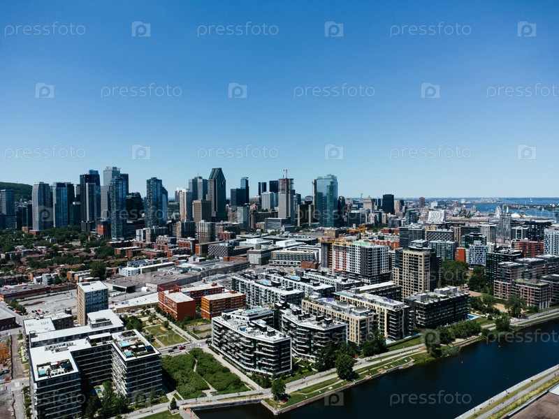 Вид из воздуха городского ландшафта с небоскребами и зелеными насаждениями.Гриффинтаун, Монреаль, Канада