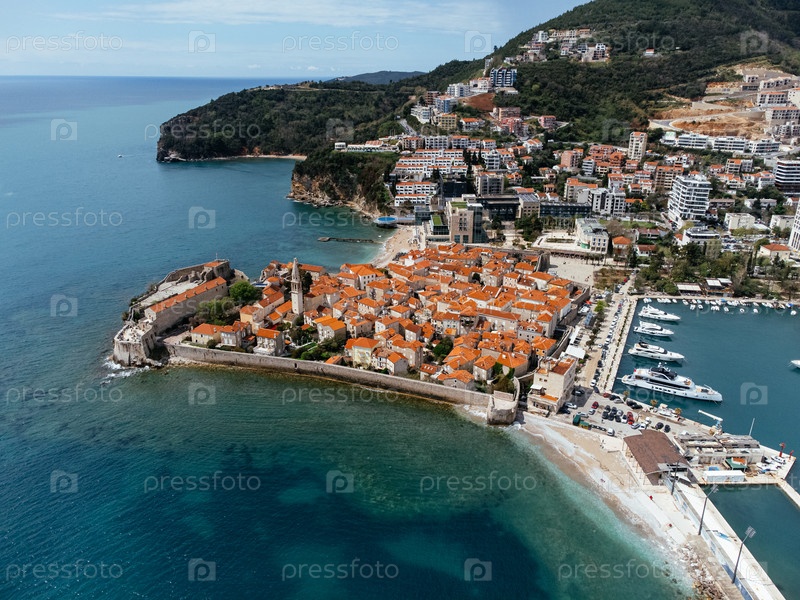Вид с воздуха на Старый город Будва, порт, пляж и горы