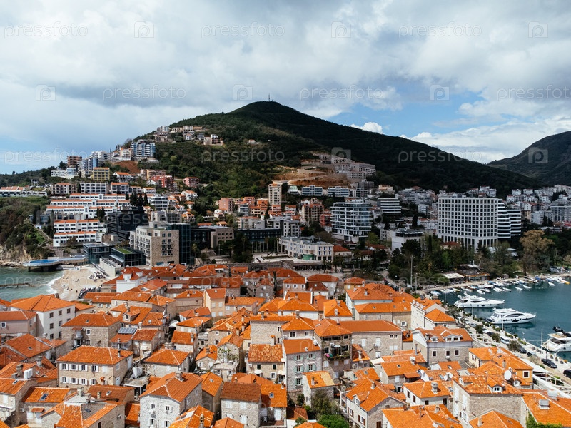 Вид с воздуха на Старый город Будва, порт, пляж и горы
