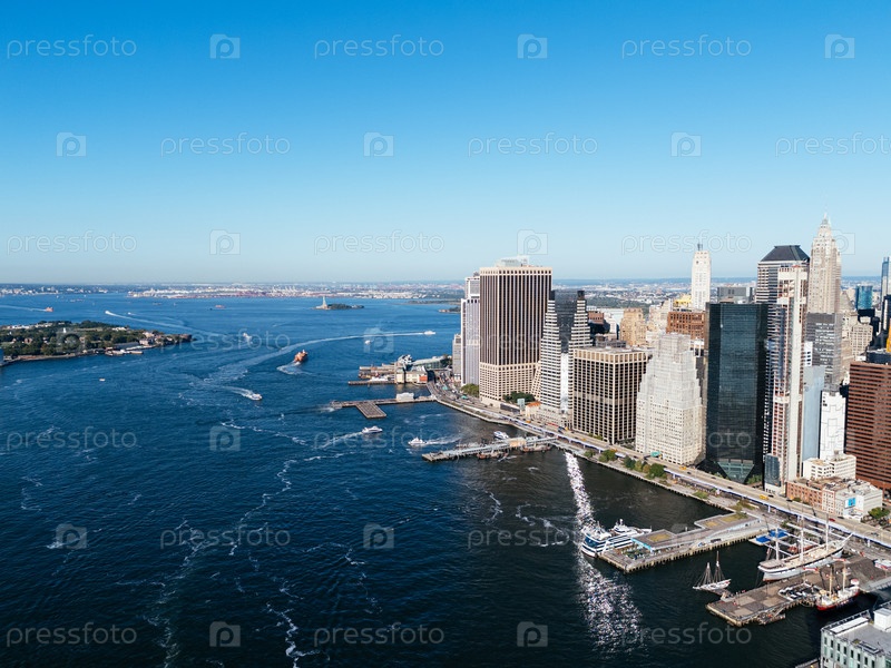 Воздушный горизонт Нижнего Манхэттена с Бруклинским мостом и одним Всемирным торговым центром, набережная Нью-Йорка