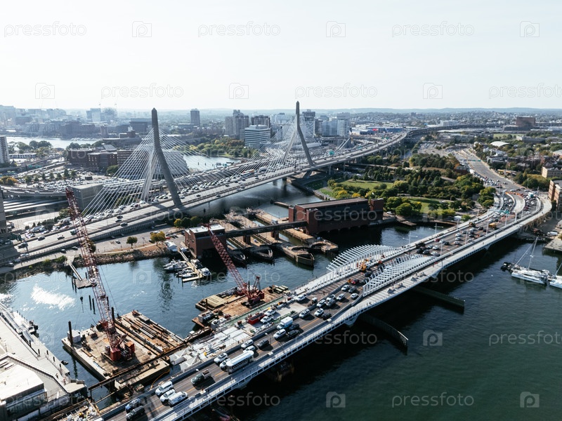 Вид из воздуха на город Бостон, мосты и реку с горизонтом в солнечном свете