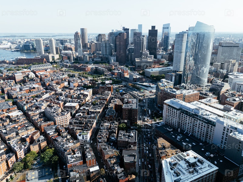 Панорамный вид на центр города Бостона. Горизонт с небоскребами. Вид из дрона сверху. Массачусетс, США