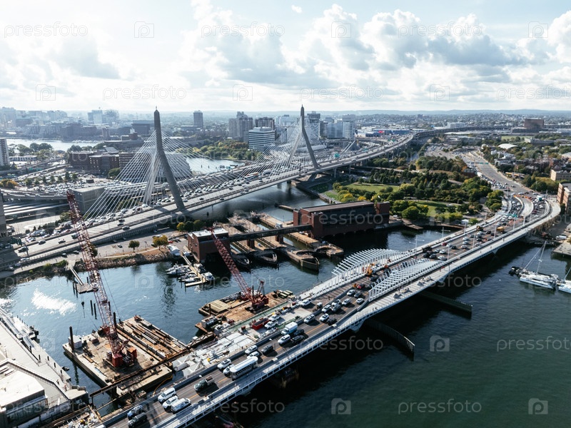 Вид с воздуха мостовой дороги с автомобилями над рекой Чарльз.Бостон.Массачусетс, США