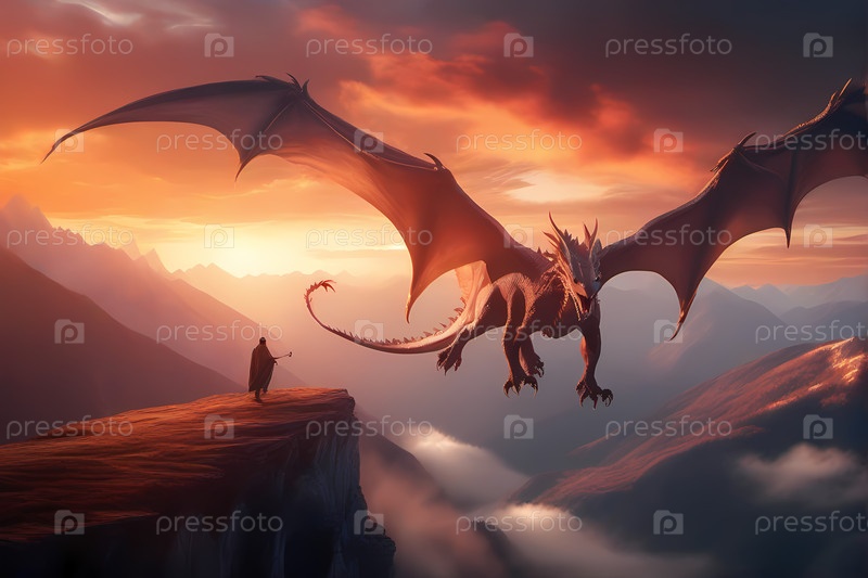 Фантастический дракон летит возле средневекового замка в туманных горах на закате, эпическая мифическая пейзажная сцена