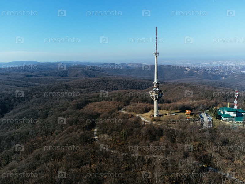 Вид с воздуха на телебашню, бомбардированную армией НАТО в 1999 году, Irishki venac, башня Фрушка, Нови-Сад, Сербия, Европа