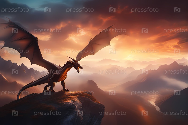 Фантастический дракон летит возле средневекового замка в туманных горах на закате, эпическая мифическая пейзажная сцена
