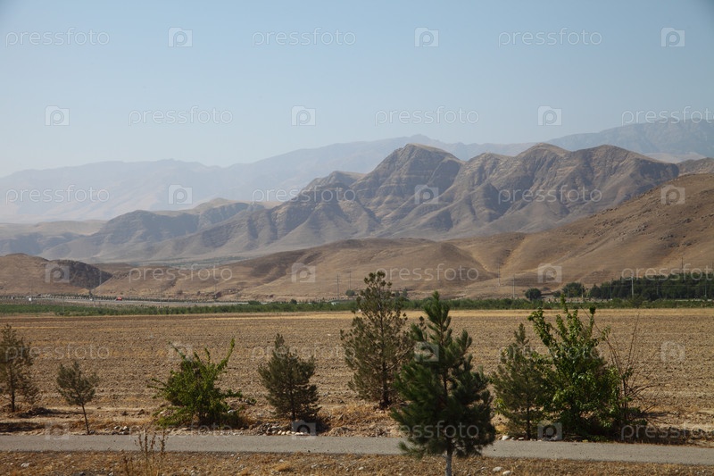 Гора Маркау возле Ашхабада с засушливой долиной, сухими холмами и редкими деревьями под чистым голубым небом