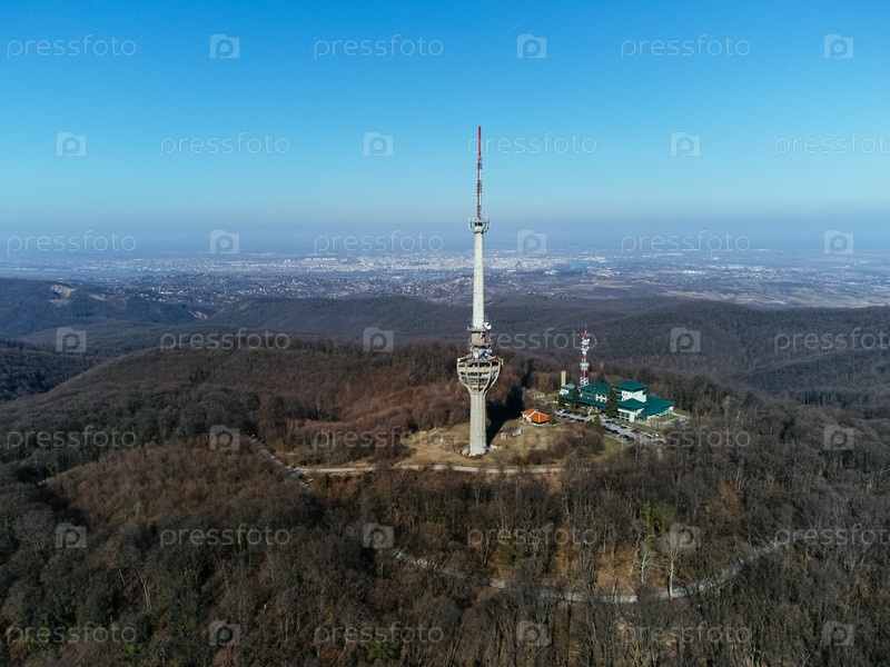 Вид с воздуха на телебашню, бомбардированную армией НАТО в 1999 году, Irishki venac, башня Фрушка, Нови-Сад, Сербия, Европа