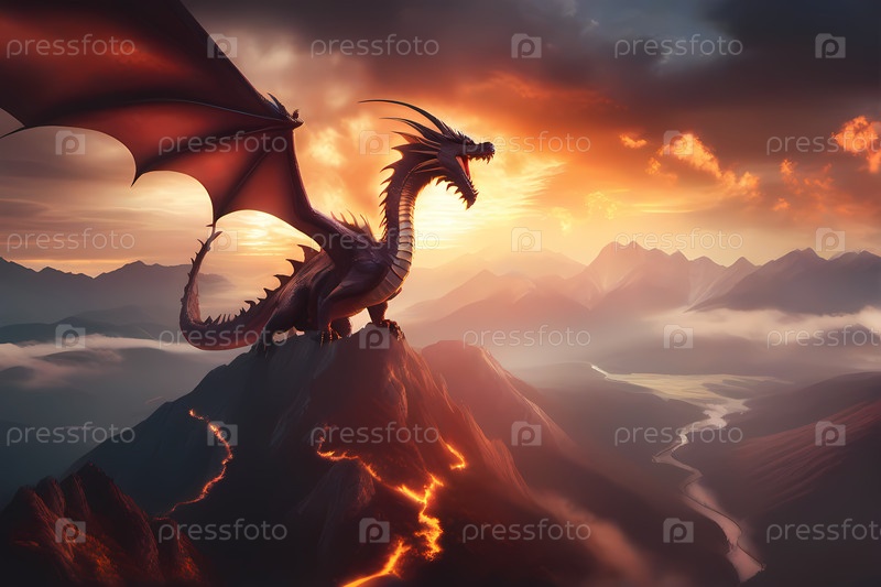 Фантастический дракон летит возле средневекового замка в туманных горах на закате, эпическая мифическая пейзажная сцена